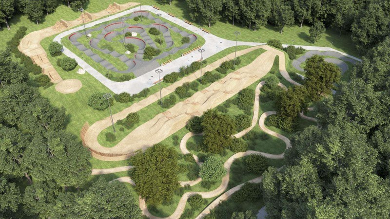 - Две асфалтови пъмп трак площадки: Една детска и една състезателна. Те са подходящи не само за велосипеди, но и за тротинетки, ролери и скейтборд;