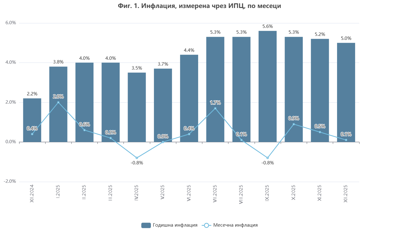 През декември индексът на потребителските цени (ИПЦ) леко се забавя в сравнение с предходните месеци. За сравнение, през ноември той бе 5.2% на годишна база, през октомври – 5.3%, а през септември достигна пик за 2025 г. от 5.6%.