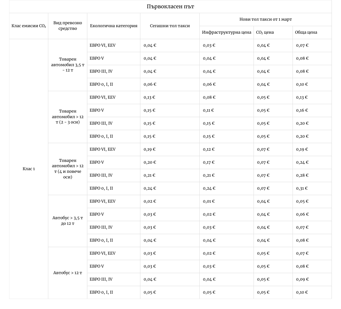 Увеличение на цените: За разлика от „тежката артилерия“, малките и средни камиони (между 3.5 и 12 тона) от клас Евро VI ще усетят поскъпване по първокласните пътища. Тяхната тарифа скача от 0.04 на 0.07 евро/км, което е покачване със 75%. Причината е, че тук инфраструктурната такса е намалена само символично (от 0.04 на 0.03 евро), а добавената CO₂ компонента от 0.04 евро почти удвоява крайната сума.