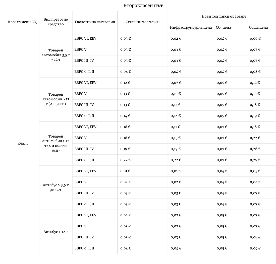 Поскъпването: За разлика от тежкия флот, по-малките камиони и автобусите ще усетят ръст на разходите при преминаване по второкласната мрежа. За товарни автомобили (3.5 – 12 т, Евро VI) тарифата скача от 0.03 евро на 0.06 евро/км, като увеличение от двойно.