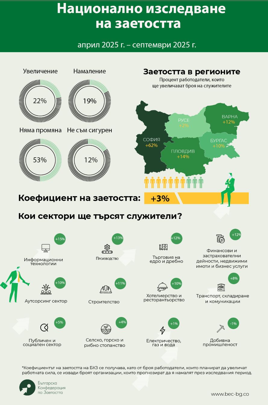 Макар че наемането на нови служители не спира, българските работодатели стават все по-внимателни при разширяването на екипите си. Това показва национално проучване на Българската конфедерация по заетостта (БКЗ) за периода април – септември 2025 г. То разкрива умерен оптимизъм, като едва 22% от анкетираните компании планират да наемат нови кадри.