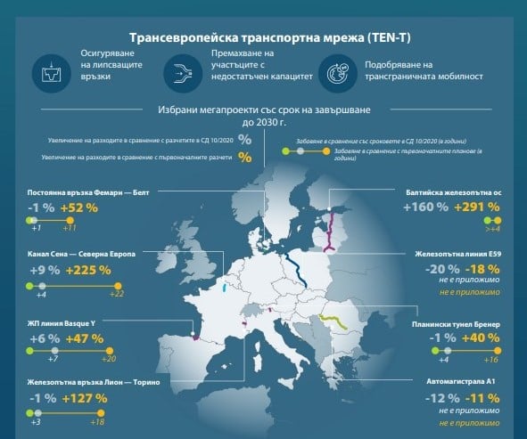 Ако допреди пет години одиторите на ЕС предпазливо прогнозираха, че завършването на основната трансевропейска транспортна мрежа (TEN-T) до 2030 г. е „малко вероятно“, днес присъдата е окончателна – целта няма да бъде изпълнена. Водещите инфраструктурни проекти на континента са поскъпнали средно с 82% спрямо първоначалните си бюджети, а закъсненията в изпълнението им вече достигат средно 17 години.