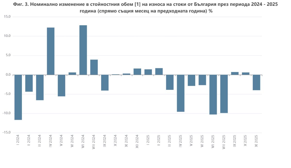 Особено тревожен е спадът при търговията с трети страни (извън ЕС), където през ноември износът се свива с 5.8%. Най-сериозен удар е регистриран в сектори като „Минерални горива, масла и подобни продукти“, където експортът се е сринал с цели 38.6%. Тази динамика подсказва, че българските производители срещат сериозни затруднения на външните пазари, породени от охлаждането на глобалното търсене и нестабилните цени на енергоносителите.