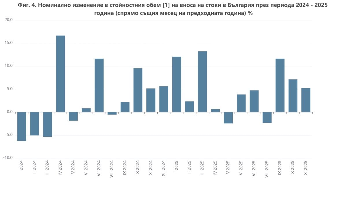 В рязък контраст с колебливия износ, вносът в страната бележи значителен скок. Само през ноември в България са внесени стоки за 9.5 млрд. лв., което е ръст от 5.2% на годишна база.
