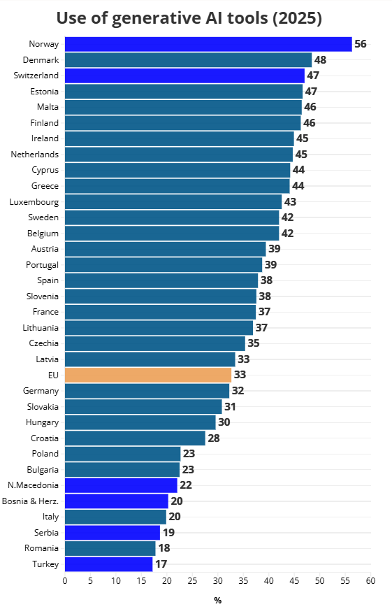 Средно за Европейския съюз около една трета от хората (33%) са използвали AI инструменти поне веднъж. Разликите по държави обаче са драстични: