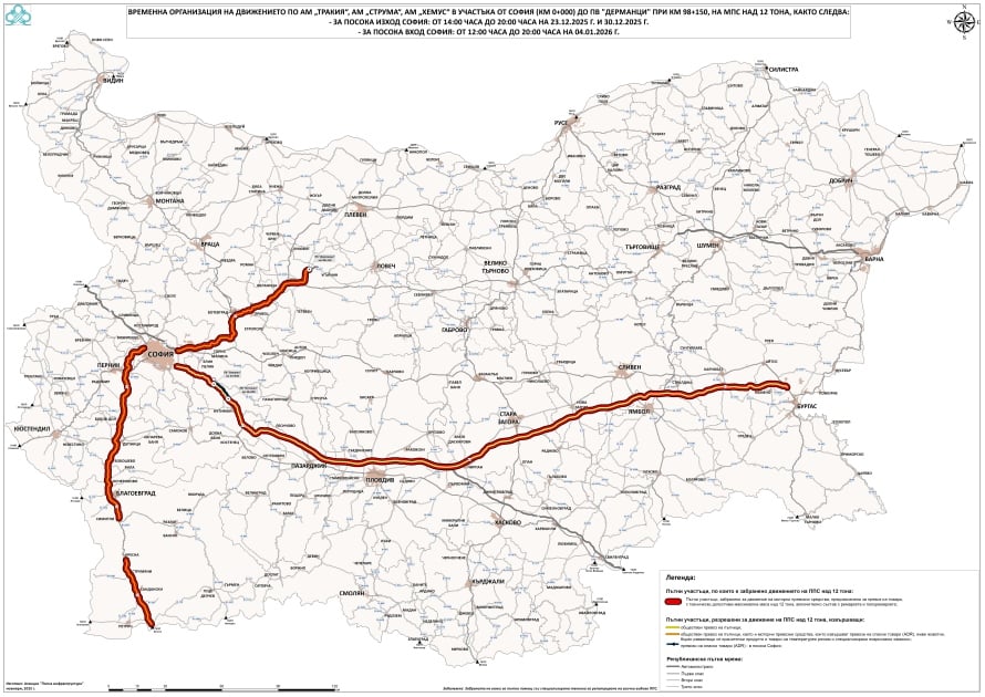Агенция „Пътна инфраструктура“ (АПИ) въвежда временни ограничения за движението на тежкотоварни моторни превозни средства (МПС) с общо тегло над 12 тона по ключови магистрални участъци в почивните дни около Коледа и Нова година. Целта на мярката е да се улесни трафикът на леките автомобили, да се повиши пропускателната способност на пътищата и да се намали рискът от инциденти, предизвикани от образуването на колони и опасни изпреварвания.