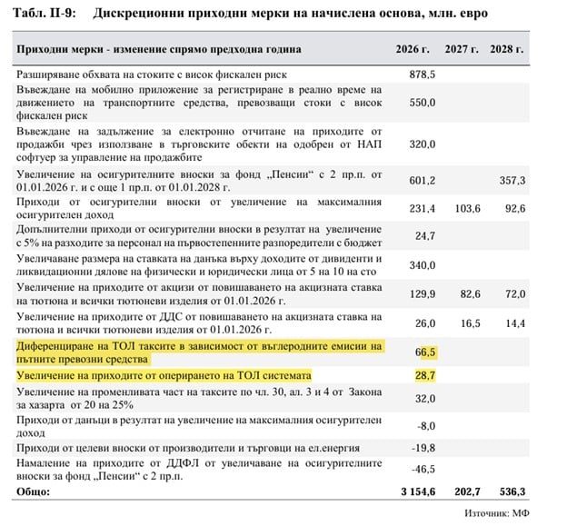 В документа е записано обаче, че „по предварителни данни през 2025 г. очакваното изпълнение на приходите от оперирането на тол системата е в размер на 522.5 млн. евро“(над 1 млрд. лв.)