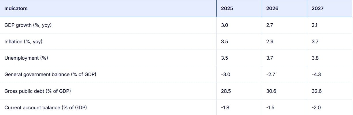 През 2026 г. натискът от разходите за заплати в публичния сектор и пенсии се очаква да стане по-умерен, а капиталовите разходи за отбрана да бъдат по-ниски, което ще доведе до намаляване на дефицита до 2.7%. Не такава е ситуацията през 2027 г.