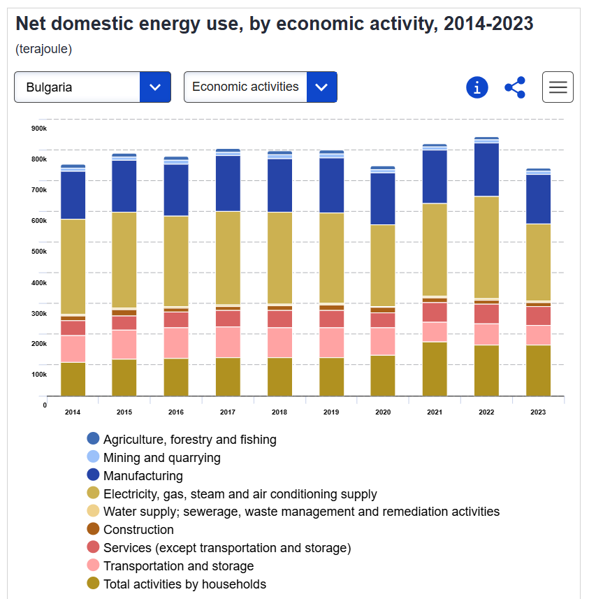 Последните данни на европейската статистическа служба Евростат за периода 2014 – 2023 г. разкриват любопитна картина на българската икономика. След пиковите нива на енергийно потребление през 2021 и 2022 г., когато икономиката се възстановяваше от пандемията, 2023 г. донесе рязко „охлаждане“. Общото нетно потребление в страната е паднало под границата от 800 хиляди тераджаула (TJ) и се приближава все повече до 700 TJ – ниво, което не бяхме виждали от началото на изследвания период.