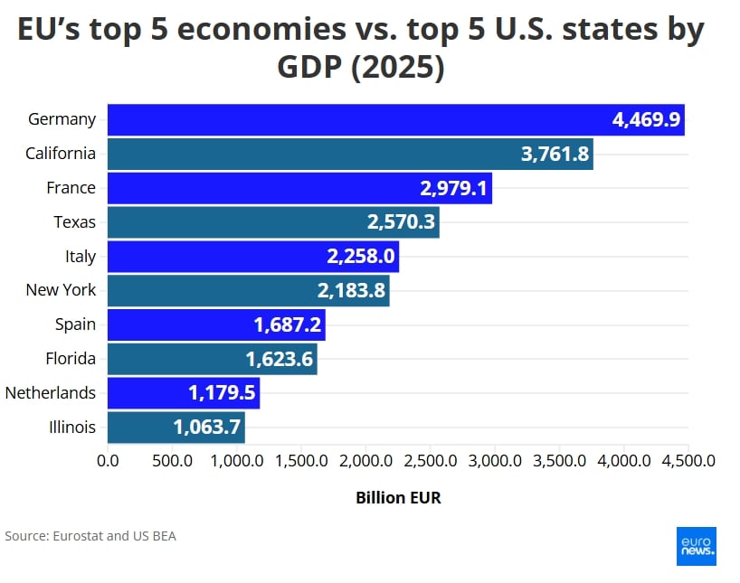Euronews Business съпоставя петте най-големи икономики в ЕС с петте най-големи щата в САЩ, като измерва както общия БВП, така и БВП на глава от населението – в номинално изражение и по паритет на покупателната способност (ППС).