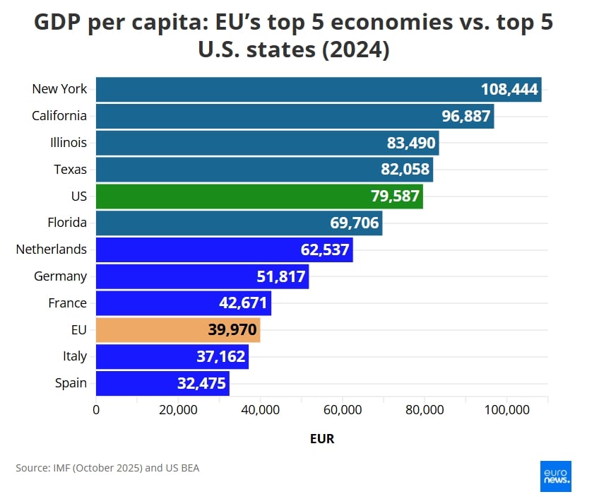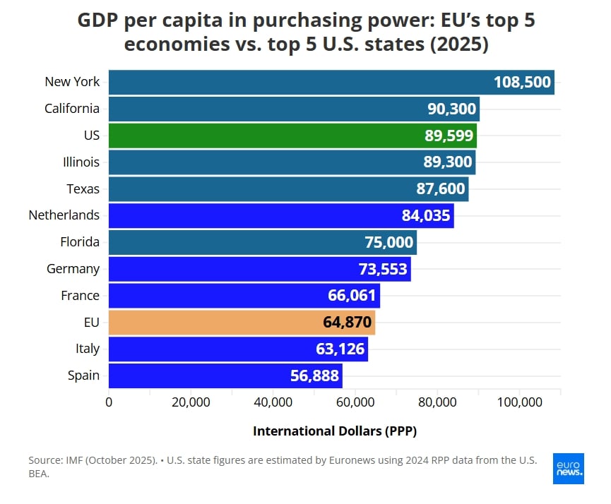 При БВП на глава от населението в международни долари, отразяващ покупателната способност, през 2025 г. – според Международния валутен фонд – американските щати се представят по-добре от икономиките на ЕС, с изключение на Флорида и Нидерландия.