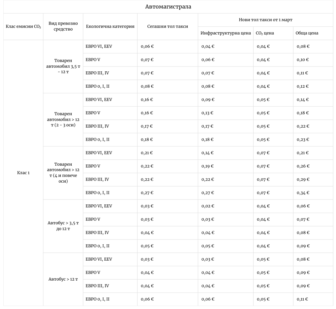 Увеличение на цените: За разлика от „тежката артилерия“, малките и средни камиони (между 3.5 и 12 тона) от клас Евро VI ще усетят поскъпване по първокласните пътища. Тяхната тарифа скача от 0.04 на 0.07 евро/км, което е покачване със 75%. Причината е, че тук инфраструктурната такса е намалена само символично (от 0.04 на 0.03 евро), а добавената CO₂ компонента от 0.04 евро почти удвоява крайната сума.