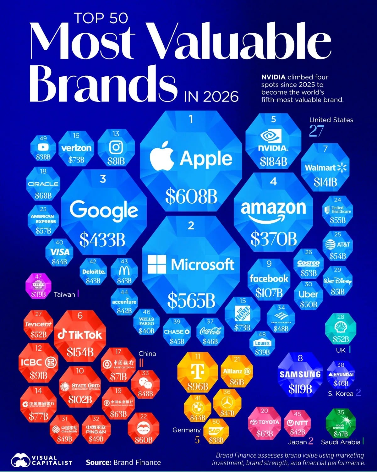 Графиката по-долу визуализира 50-те най-скъпи марки, като размерът на всеки „балон“ съответства на неговата пазарна оценка. Методологията на Brand Finance отчита не само финансовите резултати, но и инвестициите в маркетинг, лоялността на потребителите и цялостното влияние на марката върху пазара.