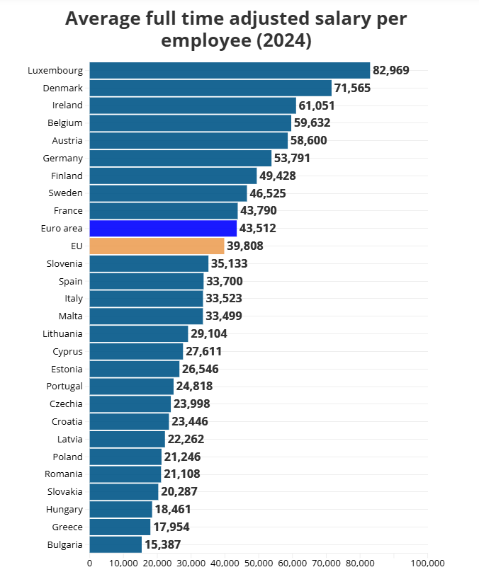 Освен Люксембург, средната заплата надхвърля 50 000 евро в още пет държави: Дания, Ирландия, Белгия, Австрия и Германия.