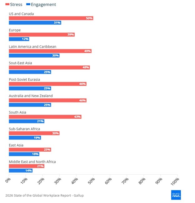 Глобалната картина разкрива ясно изразено противоречие. Европа е по-малко стресирана, но също така е и най-слабо ангажираният регион като цяло (за шеста поредна година), докато САЩ и Канада имат най-ангажираните работни сили – и едновременно с това най-стресираните.
