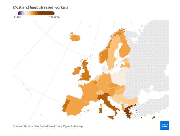 Ново изследване, обхващащо 160 държави, сравнява нивата на стрес в Европа с тези в останалата част от света и открива смесица от добри и лоши новини за служителите и работодателите на Стария континент, пише Euronews.