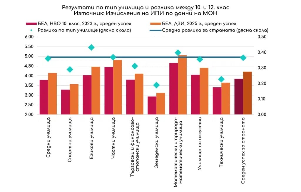 Учениците в математическите, природоматематическите и частните училища имат най-високи резултати по БЕЛ и на НВО в 10. клас, и на ДЗИ в 12. клас. Оказва се, обаче, че много високите резултати трудно могат да нараснат още. С най-голям ръст на резултата са учениците от езиковите училища, които са трети по успех.