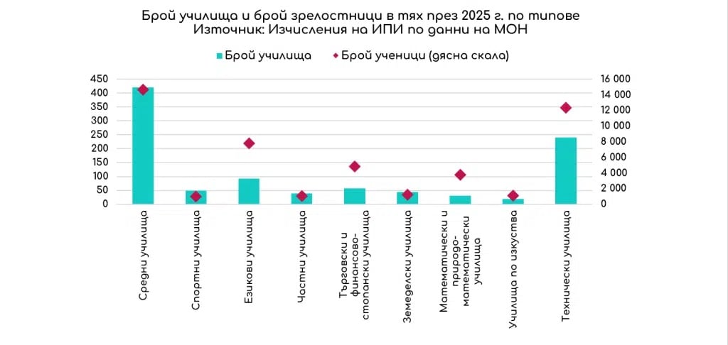 Най-много са средните училища и броят на учениците в тях – общо 420 с близо 15 хиляди зрелостници, следвани от техническите профилирани гимназии – 240 с общо 12 хиляди ученици. С най-висок брой зрелостници обаче са математическите и природоматематическите гимназии, въпреки че са едва 31 училища с под 4 хиляди зрелостници – среден брой от 122 зрелостници на училище (при 48 средно на училища в страната).