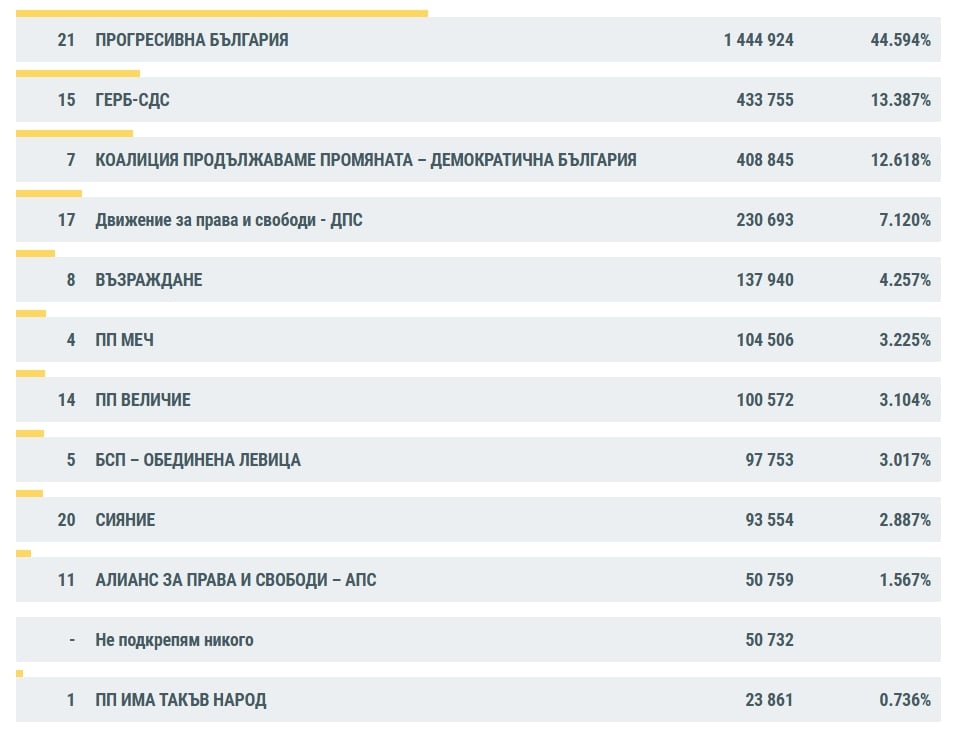 Централната избирателна комисия (ЦИК) публикува резултатите от проведените в неделя предсрочни парламентарни избори при 100% обработени протоколи. Числата показват категорична победа за „Прогресивна България“ на Румен Радев, за която са гласували 1 444 924 души (44.6%).