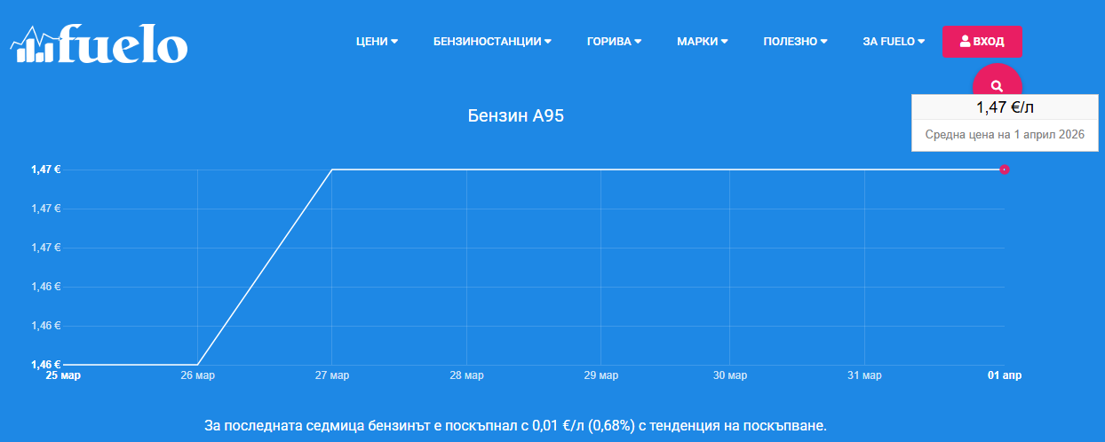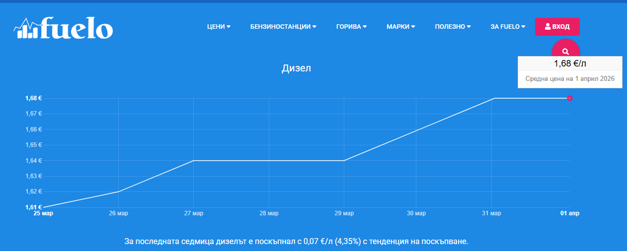 Средната цена на дизела е 1.68 евро за литър. Статистиката за последната седмица (25 март – 1 април) показва поскъпване с 0.07 евро (4.35%). Графиката на Fuelo ясно очертава стръмна възходяща тенденция, която отвежда горивото значително над нивата от предходния месец.