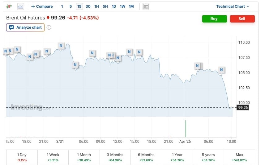 Данните на Investing.com показват, че към 10:00 ч. българско време фючърсите върху петрола сорт Брент се търгуват за 99.60 долара за барел, което е дневен спад от 3.15%. В последствие, към 11.00 ч. цената се покачи до 101.6 долара за барел, или 2.25% дневен спад.