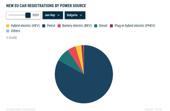Пазарът на нови автомобили в България отчита изключително силен ръст през септември 2025 г., показват данните на Асоциацията на европейските автомобилни производители (ACEA). Общият брой регистрации е скочил с 51.6%, като най-драматично е увеличението при изцяло електрическите превозни средства (BEV). Въпреки това, бензиновите автомобили остават категоричен лидер по пазарен дял, макар и с леко свиващи се показатели.