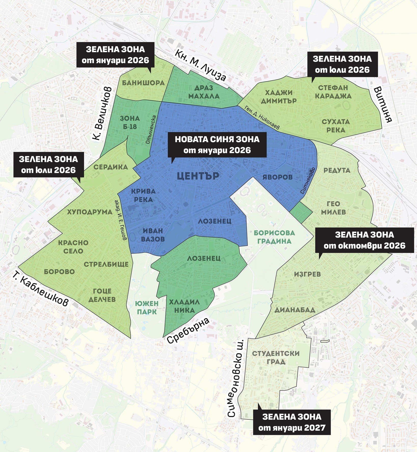 „Зелената“ зона пък се разширява, като в нея вече ще влизат „Банишора“, „Лагера“, южните квартали до бул. „Тодор Каблешков“, голяма част от „Слатина“ (вкл. „Редута“ и „Гео Милев“), „Изток“, „Изгрев“, „Дианабад“. Част от „Студентски град“ и „Подуяне“ (до ул. „Витиня“). Част от предложенията идват по линия на районните кметове, а въвеждането им ще става поетапно през 2026 г.