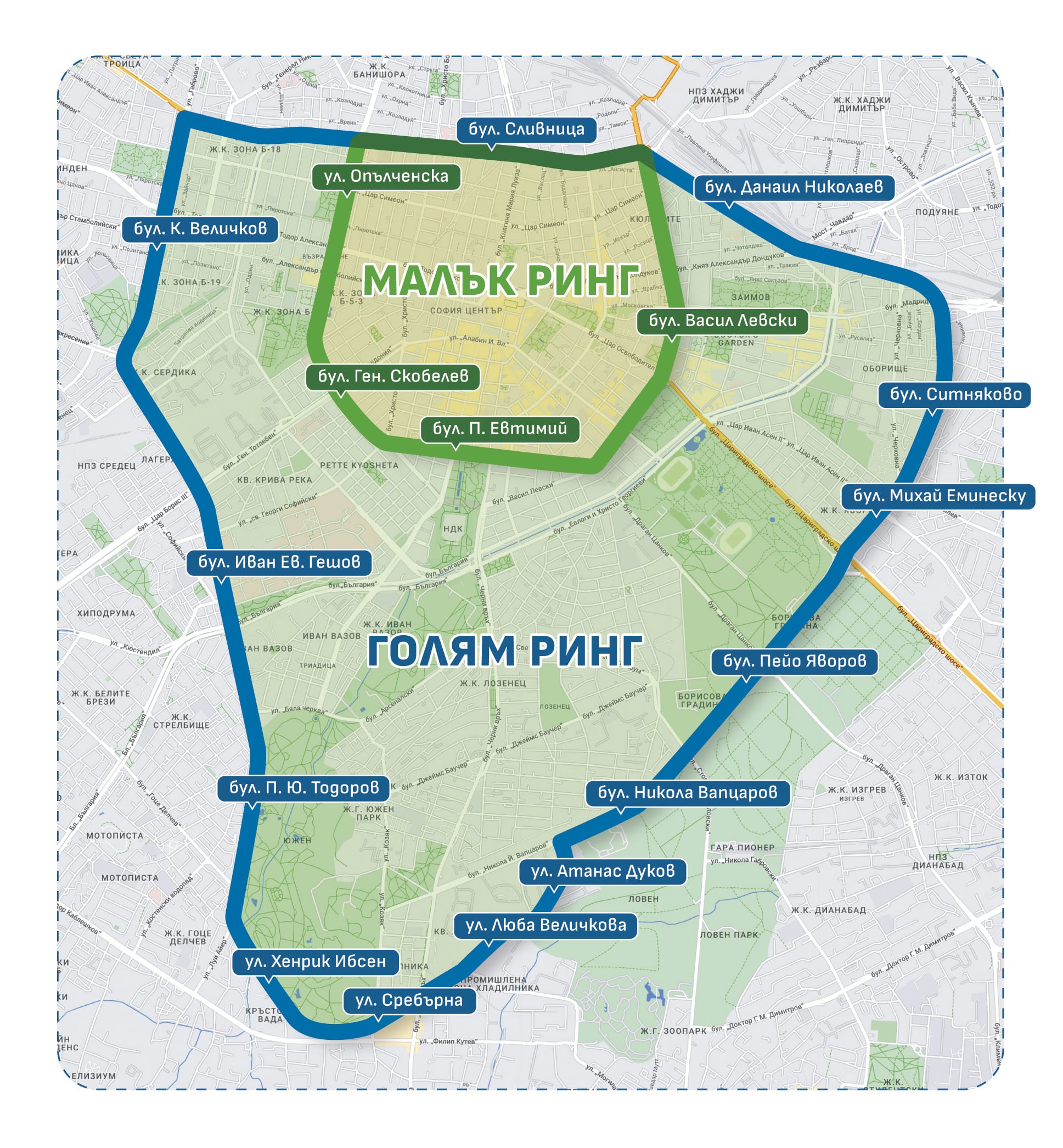 „Големият ринг“ се простира на територията между бул. „Сливница“, Сточна гара, бул. „Ген. Данаил Николаев“, бул. „Ситняково“, бул. „Пейо Яворов“, бул. „Никола Вапцаров“, бул. „Черни връх“, бул. „Хенрих Ибсен“, бул. „Иван Гешов“ и бул. „Константин Величков“. Тук ще бъдат забранени коли от първа категория за първи път през тази година.